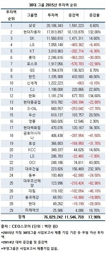 그룹별로는 삼성그룹이 총 20조1063억 원을 투자, 부동의 1위를 고수했다. 삼성은 2014년 18조5151억 원보다 투자액을 1조5912억 원(8.6%) 늘렸다. 2위는 17조8138억 원을 투자한 현대차그룹이 차지했다.