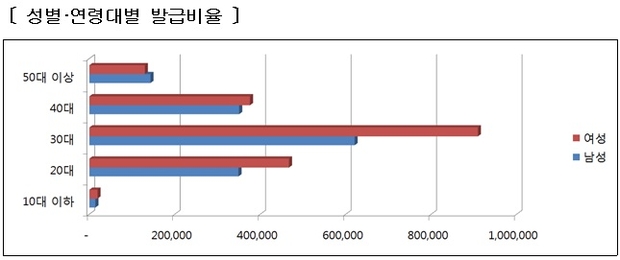 연령별로는 전체 발급건수 중 30대의 비중이 45.3%(152만 건)로 20대(81만 건)․40대(72만 건)의 약 2배를 차지하여, 30대가 해외직구를 주도하고 있는 것으로 분석됐다.