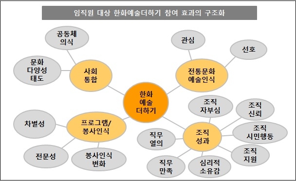 참여 임직원들을 대상으로 한 조사에서는 전체적으로 높은 수준의 전통문화교육 프로그램 만족도(5.75, 7점 만점)를 보였고, 참여횟수가 많은 임직원일수록 전통문화예술에 대한 관심과 선호 및 공동체 의식(5.30 vs. 5.52, 7점 만점) 수준이 높았다.
