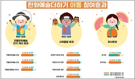 조사 결과, 참여 아동들은 인성 및 정서적인 측면에서 긍정적인 효과를 보였고, 프로그램 참여 전에 비해 전통문화예술 인식 선호(3.50→3.79, 5점 만점), 문화적 다양상 관심, 다문화 인지태도, 공동체 의식(3.84→4.15, 5점 만점) 등이 향상됐다.