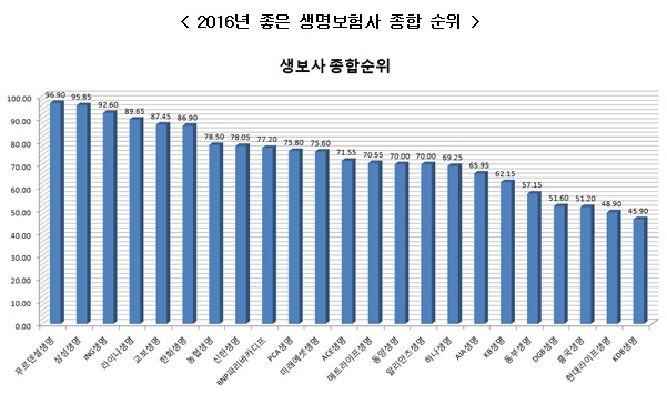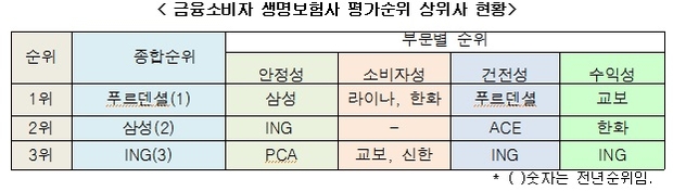 금융소비자연맹은 3일 2015년 12월말 현재 23개 생명보험회사의 경영공시자료를 비교 분석하여 “2016년 좋은 생명보험회사 순위”를 공개했다. 종합평가 결과 1위는 푸르덴셜생명, 2위 삼성생명, 3위 ING생명인 것으로 나타났다. 안정성은 삼성생명, 소비자성은 라이나생명과 한화생명이 1위를 차지 하였고, 건전성은 푸르덴셜생명, 수익성은 교보생명이 1위를 차지했다.