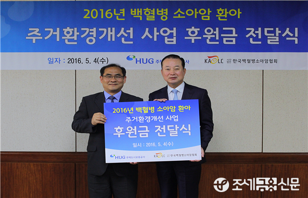 (조세금융신문=김사선 기자) 주택도시보증공사(사장 김선덕, 이하 HUG)는 어린이날을 하루 앞둔 4일 ‘백혈병·소아암 환아 주거환경개선 사업 후원금 전달식’을 갖고 5천만원을 (사)한국백혈병소아암협회에 전달했다.