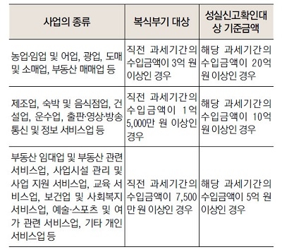 또한, 해당 과세기간의 수입금액이 일정규모 이상인 경우에는 성실납세를 위하여 종합소득과세표준 확정신고를 할 때에 사업소득금액의 적정성을 세무사 등이 확인하고 작성한 성실신고확인서를 별도로 제출하여야 한다. 복식부기 대상자와 성실신고확인대상의 기준을 정리해보면 표와 같다.