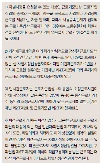 사용자의 차별처우로부터 보호를 받을 수 있는 차별시정 신청권자는 (i)근로기준법상의 근로자이어야 하며 (ii)근로자 중에서도 기간제근로자, 단시간근로자 및 파견근로자이다.