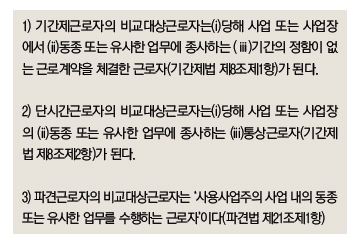 기간제·단시간·파견근로자에 대한 차별판단을 위해서는 이들 주체와 비교할 수 있는 다른 대상이 존재해야 한다. 비교대상근로자는 불리한 처우가 있었는지 여부를 판단하는 비교기준으로서의 역할뿐만 아니라 시정명령의 내용을 결정하는 근거 및 기준으로서의 역할도 수행하게 된다.