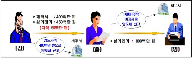 (갑)은 보유주택을 (을)에게 450백만원에 양도(취득가액 300백만원)하면서 세금을 적게 내기 위해 400백만원에 양도한 것으로 다운계약서 작성하고 양도소득세 신고했고, (을)은 같은 주택을 1세대 1주택 비과세 요건을 갖춘 후 (병)에게 800백만원에 양도하고 양도소득세 비과세 신고했다.