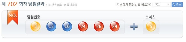 (조세금융신문=하지연 기자) 나눔로또가 제702회 로또당첨번호를 14일 발표했다. 로또 702회 1등 당첨번호는 '3, 13, 16, 24, 26, 29'이다. 2등인 보너스 번호는 '9'이다.