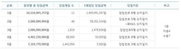 당첨번호 5개를 맞힌 3등은 1,819명으로 각각 147만원씩 받는다. 당첨번호 4개를 맞힌 4등(고정 당첨금 5만원)은 8만8,043명, 당첨번호 3개가 일치한 5등(고정 당첨금 5,000원)은 144만3,954명이다.
