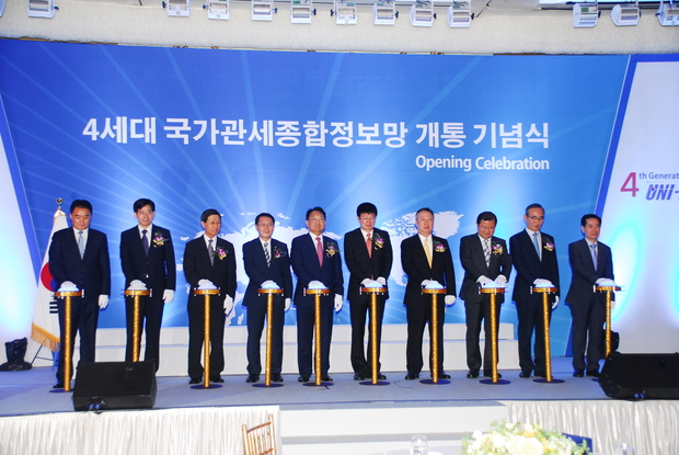 (조세금융신문=하지연 기자) 지난 4월 23일 개통한 4세대 국가관세 종합정보망(이하 국종망) 개통 축하식이 15일 오후 서울 임피리얼 팰리스 호텔에서 개최됐다. 참석한 주요 내빈들이 4세대 국종망의 공식 개통을 알리는 버튼 점등식을 하고 있다. 사진 왼쪽에서 (네번째)천홍욱 관세청장, (다섯번째)유일호 부총리, (여섯번째)이종구 국회의원, (일곱번째)박용만 대한상의회장.