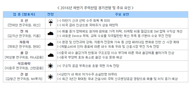 반면 조선업종은 미미한 수주 회복, 캐나다 원유 생산회복, 미국 금리인상으로 인한 국제유가 상승 제한의 영향으로 하반기에도 불리한 환경이 계속될 것으로 예상됐다.