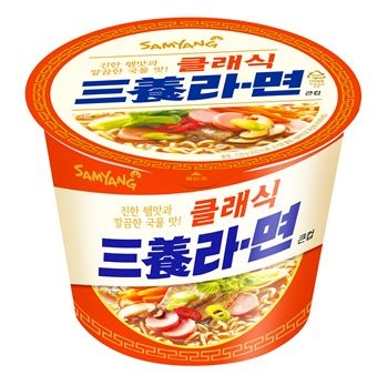 신제품 큰컵 삼양라면 클래식은 진한 햄 맛과 계란 지단, 햄 후레이크 등을 즐길 수 있으며, 감자 전분을 첨가해 쫄깃하고 탱탱한 면발이 특징이다.