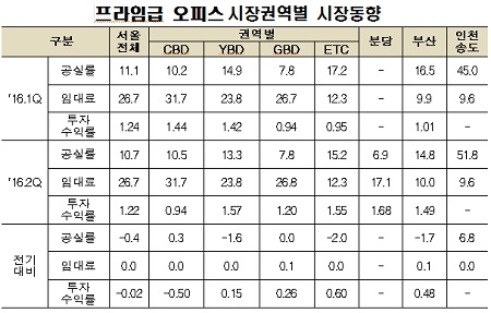 한국감정원이 13일 발표한 ’16년 2분기 프라임급 오피스빌딩 시장동향에 따르면 인천송도는 임차인 수요에 비해 공급이 많아 공실률이 전분기 대비 6.8%p 상승한 것으로 조사됐다.