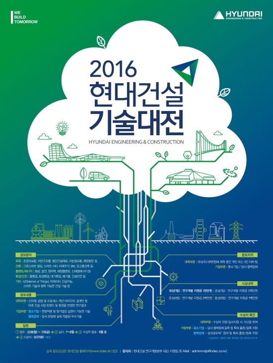 (조세금융신문=유명환 기자) 현대건설이 중소기업 및 국내외 대학(원)생 대상으로 ‘2016 현대건설 기술대전’을 실시한다고 14일 밝혔다.응모분야는 ▲토목분야 ▲건축분야 ▲플랜트‧에너지분야 ▲환경‧안전분야 ▲기타 IoT(Internet of Things), 인공지능, 스마트 건설 기술 등이다.