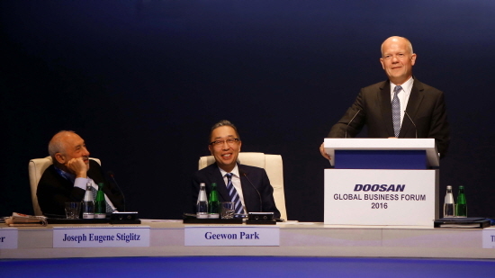 (조세금융신문=유명환 기자) 두산그룹이 15일(현지시간) 스코틀랜드에서 윌리엄 헤이그 전 영국 외무장관, 조지프 스티글리츠 미국 컬럼비아대 교수 등이 참석한 가운데 ‘2016 두산 글로벌 비즈니스 포럼’을 개최했다고 18일 밝혔다.박지원 두산그룹 부회장은 개회사에서 “복잡한 환경에서도 새로운 돌파구를 찾아 목표를 달성하는 것이 비즈니스 리더들의 숙명”이라며 “곳곳에 리스크 요인이 많은 지금의 경영 환경을 극복하고 새롭게 도약하는 데 이번 포럼이 도움이 됐으면 한다”고 말했다.