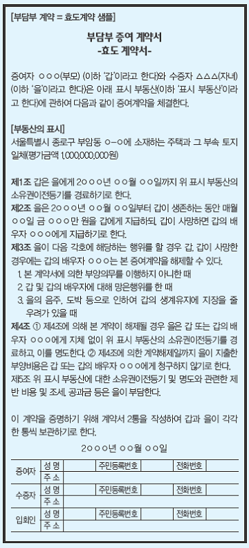 부담부 증여계약(일명 효도계약)서를 작성할 때는 증여하는 재산을 구체적으로 기재하고 그 평가액까지 기재한다. 이행해야할 부양의무를 구체적으로 기재하고 부양의무를 이행하지 않으면 받은 재산을 되돌려준다는 내용도 같이 포함시켜야 한다.