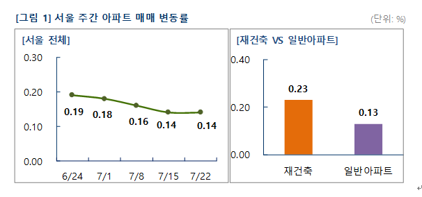 (조세금융신문=유명환 기자) 정부의 중도금 대출규제와 분양보증 심사 강화 등에 영향으로 국내 부동산 시장이 숨고르기에 들어갔다. 특히 서울 강남3구를 중심으로 아파트 매매 가격이 0.14% 상승하는데 그쳤다.25일 114 부동산에 따르면 7월 3주차(15~22일) 서울 아파트 매매가 상승률은 전주대비 0.14%로 조사됐다. 이는 전월(6월 4주차)에 0.19%를 기록한 이후, 4주 연속 ‘제자리걸음’을 보이고 있다.
