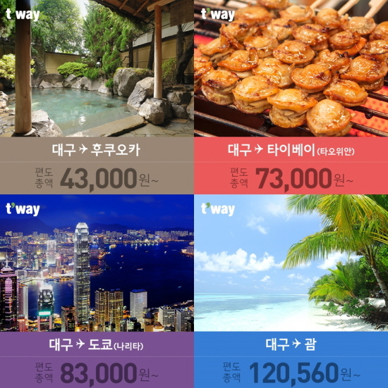 티웨이항공 관계자는 “티웨이항공만의 특화된 대구발 국제선으로 영남권 지역에서도 공항 이용에 불편 없이 즐거운 여행길에 오르시길 바란다”고 밝혔다.