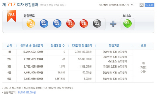 제716회 로또복권 1등 당첨자는 각각 27억243만원을 받게 됐다.28일 나눔로또에 따르면 지난 27일 제717회 로또복권 1등 당첨번호는 ‘2, 11, 19, 25, 28, 32’이 선정됐다. 2등 보너스 번호는 ‘44’