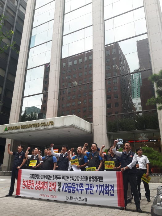 현대증권 노조는 30일 오전 금융위원회를 직접 방문해 상장 폐지에 대한 반대 입장을 표명하고 임직원들의 반대 항의 서한을 제출한데 이어 오후 2시에는 현대증권 본사앞에서 현대증권 상장폐지 및 KB금융지주 규탄 기자회견을 가졌다.