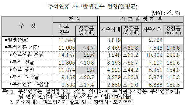 다만 추석연휴기간동안 일평균 사고발생건수는 평상시 11,548건 보다 4.7% 낮은 11,005건으로 오히려 줄었다.