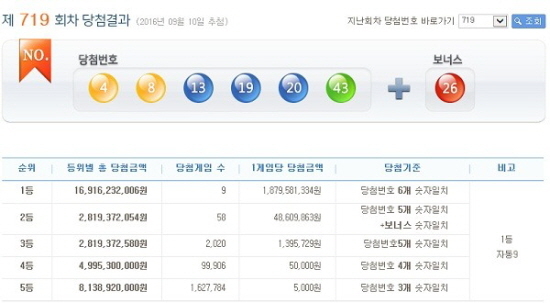 지난 10일 제719회 나눔로또 추첨 결과 1등 당첨자는 9명으로, 각각 18억7958만1334원을 지급 받는다. 1등 당첨자의 복권 구입방식은 모두 자동이다.