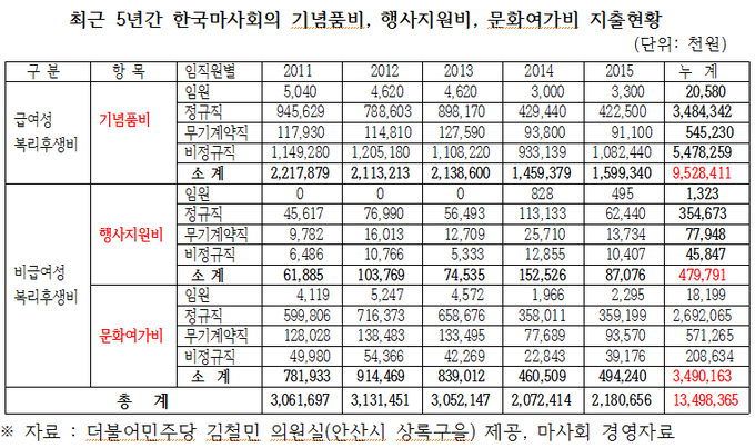 아울러 5년간 비급여성 복리후생비 명목 하에 행사지원비로 4억 7천 979만원, 문화여가비로 34억 9천 13만원을 지출했다. 행사지원비는 임원에게 132만 3천원, 정규직 3억 5천 467만원, 무기계약직 7천 794만원, 비정규직 4천 584만원을 지출했다.