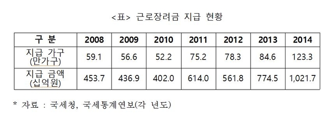 2008년 근로장려금이 지급되기 시작한 이후 지급가구와 금액은 2배 이상 증가해, 2014년에는 123만3천가구에 1조217억원이 지급됐다.