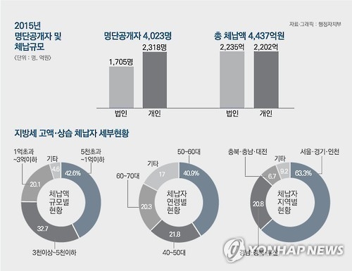 지방세 체납자 명단 공개는 2006년부터 시작됐는데 당초 체납액 3천만원 이상이었다가 올해부터 1천만원 이상으로 확대됐다.