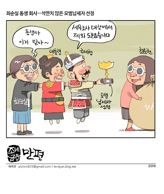 [조세금융만평] 최순실 동생 회사…석연치 않은 모범납세자 선정