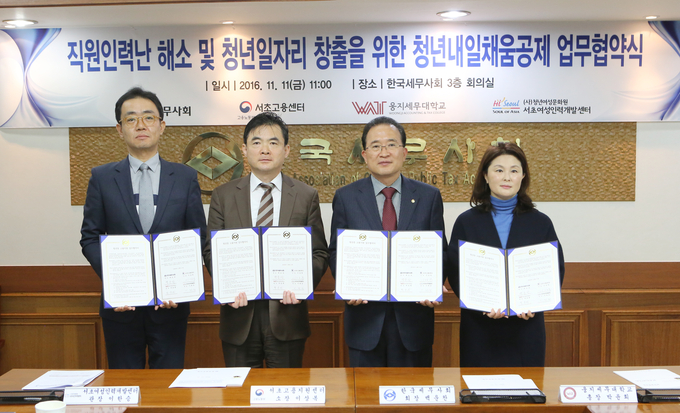 (조세금융신문=이지한 기자) 한국세무사회(회장 백운찬)는 11일 서초고용센터, 서초여성인력개발센터, 웅지세무대학교와 ‘청년내일채움공제 활용을 통한 세무사사무소 인력난 해소 업무협약(MOU)’을 체결했다.