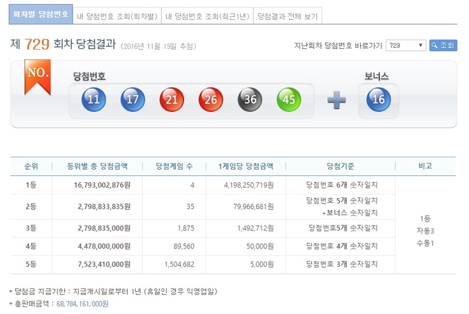 (조세금융신문=온라인뉴스팀) 제729회차 나눔로또 행운의 1등 당첨번호는 ‘11, 17. 21. 26. 36, 45’, 보너스 번호는 ‘16’이다.