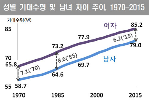 이날 통계청이 발표한 ‘2015 생명표 요약’에 따르면 2015년 출생아의 기대수명은 전체 82.1년으로 남자 경우 79년, 여자 경우 85.2년으로 나타났다. 이는 지난 2014년 대비 전체 0.3년, 남자 0.4년, 여자 0.1년이 증가한 수치다.