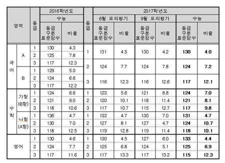 아울러 수험생 진학 지도를 위해 ‘영역 별 표준점수 및 2017 수능 등급컷 자료도 공개됐다.