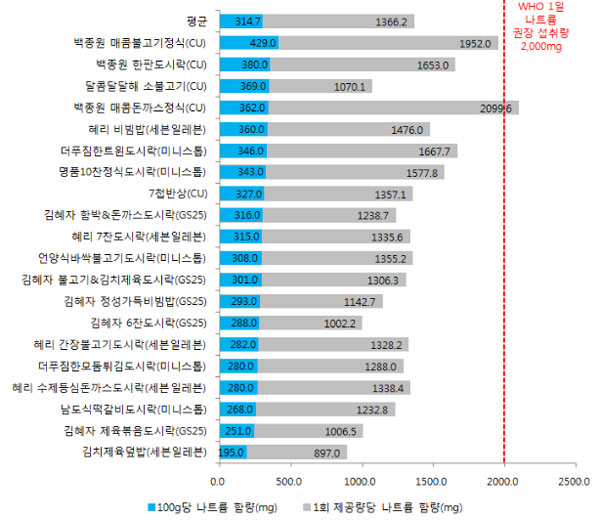 이는 편의점 도시락 한끼 만으로도 1일 나트륨 섭취 권고량의 2/3이상을 섭취하게 되는 것으로, 나트륨을 과다하게 섭취할 가능성이 크다.