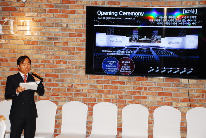 (조세금융신문=김필주 기자) 전중훤 총무이사가 IFA 2018 서울 개최와 관련 진행 상황을 스크린을 통해 설명하고 있다.