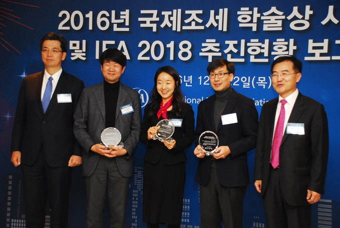 (조세금융신문=김필주 기자) 2016년 국제조세 학술상 수상자들 좌측 두번째 부터 서울시립대학교 법학전문대학원 이재호 부교수, 김경하 회계사, 서울대학교 법학과 윤지현 부교수