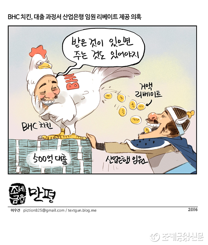[조세금융만평] BHC 치킨, 대출 과정서 산업은행 임원 리베이트 제공 의혹