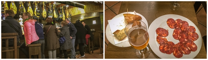 ▲ 아쉬운 마음에 들어간 가게. 스페인은 하몽이 유명하다고 하더니 하몽을 사서 가기도 하고 시켜서 먹기도 하는 곳인 듯했다. 대충 메뉴를 보고 추측을 통해 시킨 맥주와 안주거리이다.