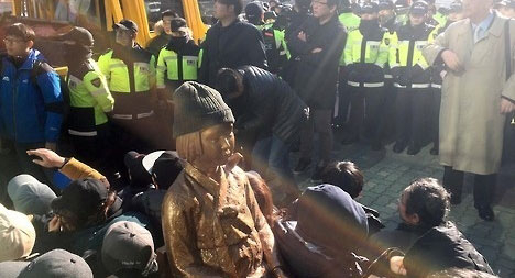 28일 시민단체들은 부산 동구 초량동 정발장군 동상 앞에서 위안부 문제 해결 수요집회를 연 뒤 인근 일본영사관 앞에 부산 소녀상을 설치했다.