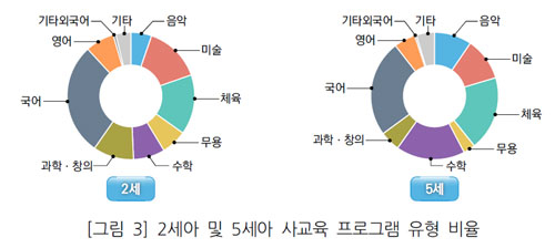 5세아 경우 국어(24.5%)가 가장 많았고, 다음으로 체육(19.0%), 수학(17.3%), 미술(11.0)%, 음악(9.4%), 영어(5.5%), 과학・창의(5.1%) 순으로 나타났다.