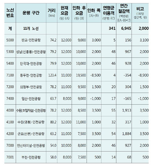 때문에 경기도는 이번 작업을 통해 노선별로 1천원~4천원 정도 요금이 인하될 것으로 보고 있다.