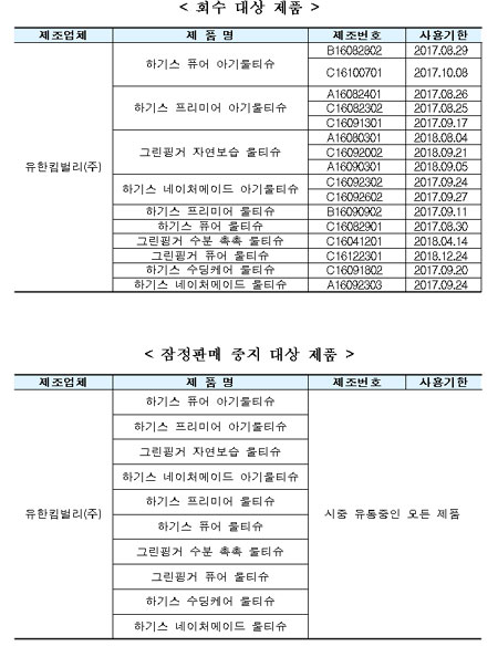 또한 허용기준을 초과할 가능성이 있는 하기스 물티슈 등 10개 품목(시중 유통중인 모든 제품)에 대해서도 잠정 판매중지하고 ‘검사명령’을 지시했다.