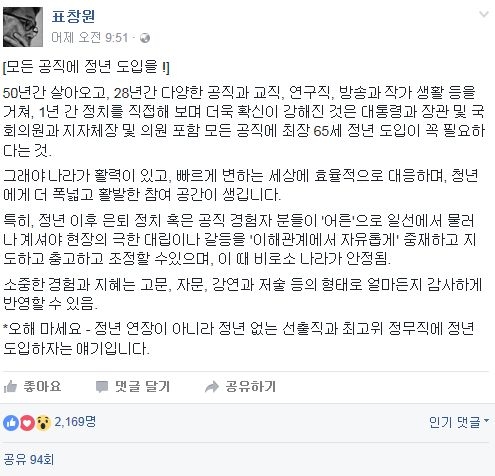 지난 16일 표창원 의원은 자신의 페이스북을 통해 “대통령과 장관, 국회의원과 지자체장 등을 포함한 모든 공직에 정년 도입이 꼭 필요하다”고 주장했다.