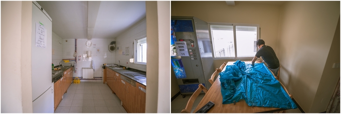 ▲ 알베르게 내부 주방과 비 옷이 너무 길다고 밑에 부분을 접어서 붙이고