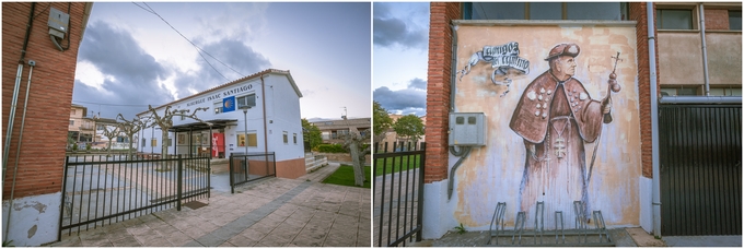 ▲ 성당 앞을 지나오면 풍경이 조금 바뀐다. 밑에 사진 중 왼쪽은 오늘 묵을 알베르게이고 오른쪽 사진은 알베르게 벽에 그려져 있는 사진이다.