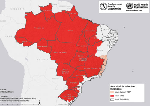 2일 질병관리본부는 현재 브라질에서 황열 환자 발생 사례가 급증하고 있어, 브라질 여행객은 출국전 10일 이내에 황열 백신을 접종하고 브라질 현지에서 모기물림에 주의할 것을 당부했다.