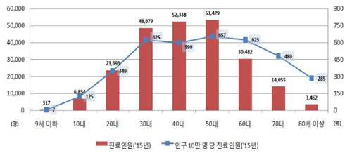연령대별 인구 비율을 고려한, 인구 10만 명 당 진료인원 수를 분석한 결과에서 50대 657명으로 가장 많은 것으로 나타났는데, 이는 전체 연령 평균인 462명 보다 195명을 웃도는 수치였다. 이 외에도 60대와 30대(625명), 40대(599명), 70대(480명)에서 평균치 이상의 진료인원을 보였다.
