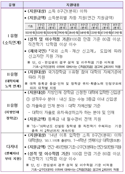 국가장학금 지원을 위해서는 신청학생 가구의 소득 및 재산 조사를 위한 학생 본인 및 가구원(미혼 : 부모 모두, 기혼 : 배우자)의 정보제공 동의 절차(공인인증서 활용 동의)가 필요하며, 정보제공 동의를 완료해야만 지원 받을 수 있다.