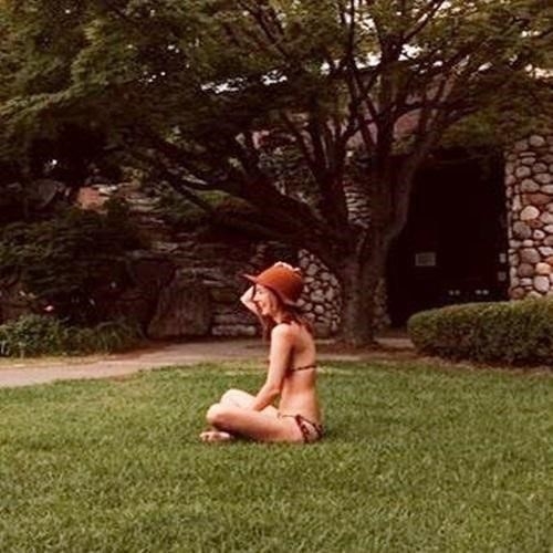 게재된 사진 속 한채아는 비키니 수영복을 입고 잔디밭에 앉아 환하게 웃고 있다.