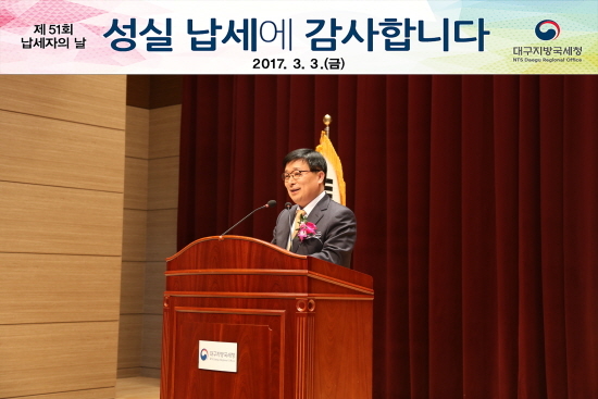(조세금융신문=고승주 기자) 대구지방국세청()이 3일 오전 10시 정부대구지방합동청사 2층 대강당에서 모범납세자와 지역 경제인과 국세공무원 등 240여명이 참석한 가운데 ‘제51회 납세자의 날’ 기념식을 열었다.